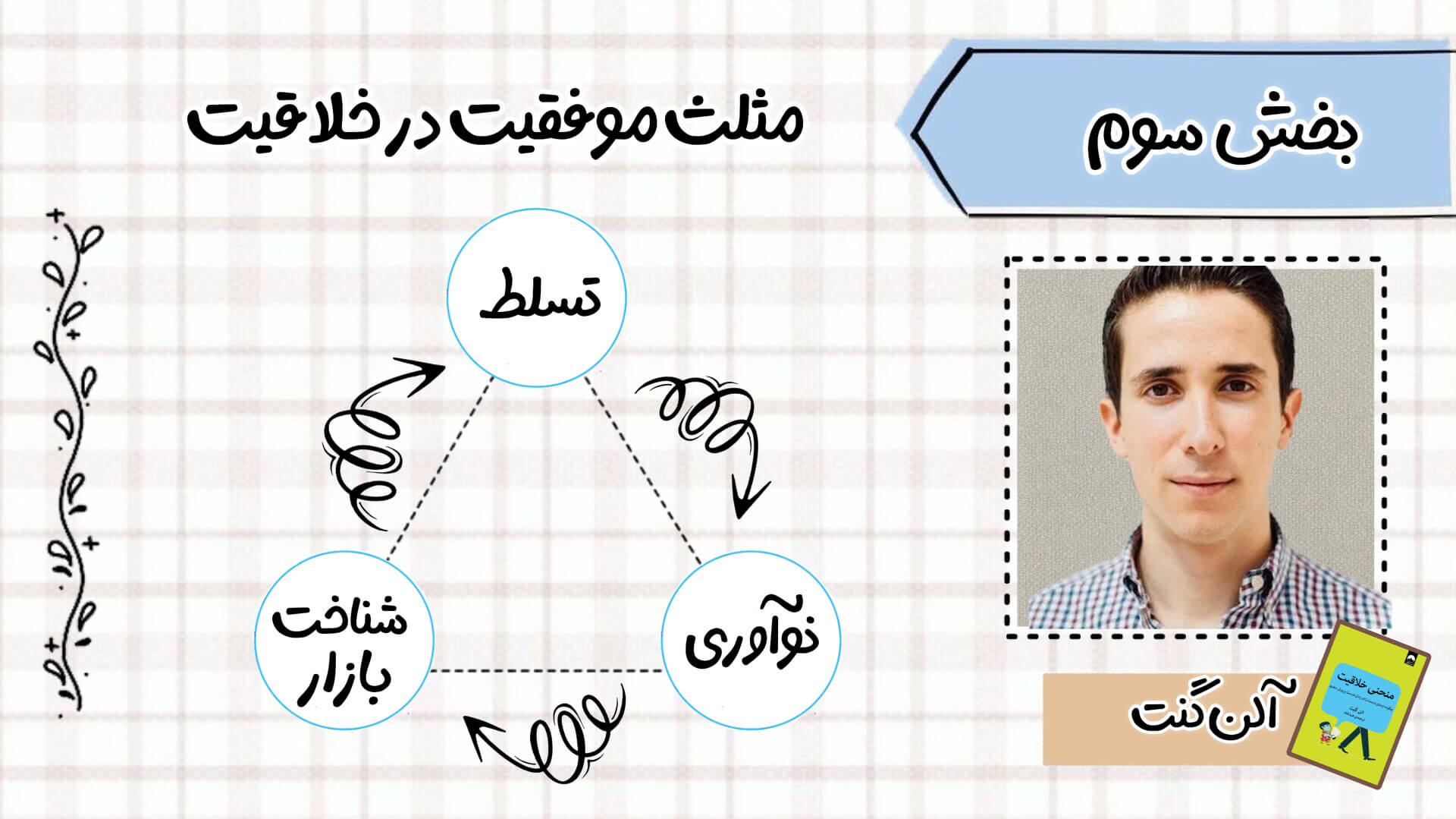 در ادامه یکی از بخشهای مهم کتاب معرفی مدلی است که آلن آن را مثلث موفقیت در خلاقیت مینامد. این مثلث شامل سه ضلع کلیدی است که او آنها را بهعنوان عوامل اساسی برای موفقیت خلاقانه معرفی میکند. او توضیح میدهد که هر ضلع این مثلث در کنار دیگری به یک فرد خلاق کمک میکند تا ایدههایش را به موفقیتهای واقعی تبدیل کند. این سه ضلع عبارتند از: